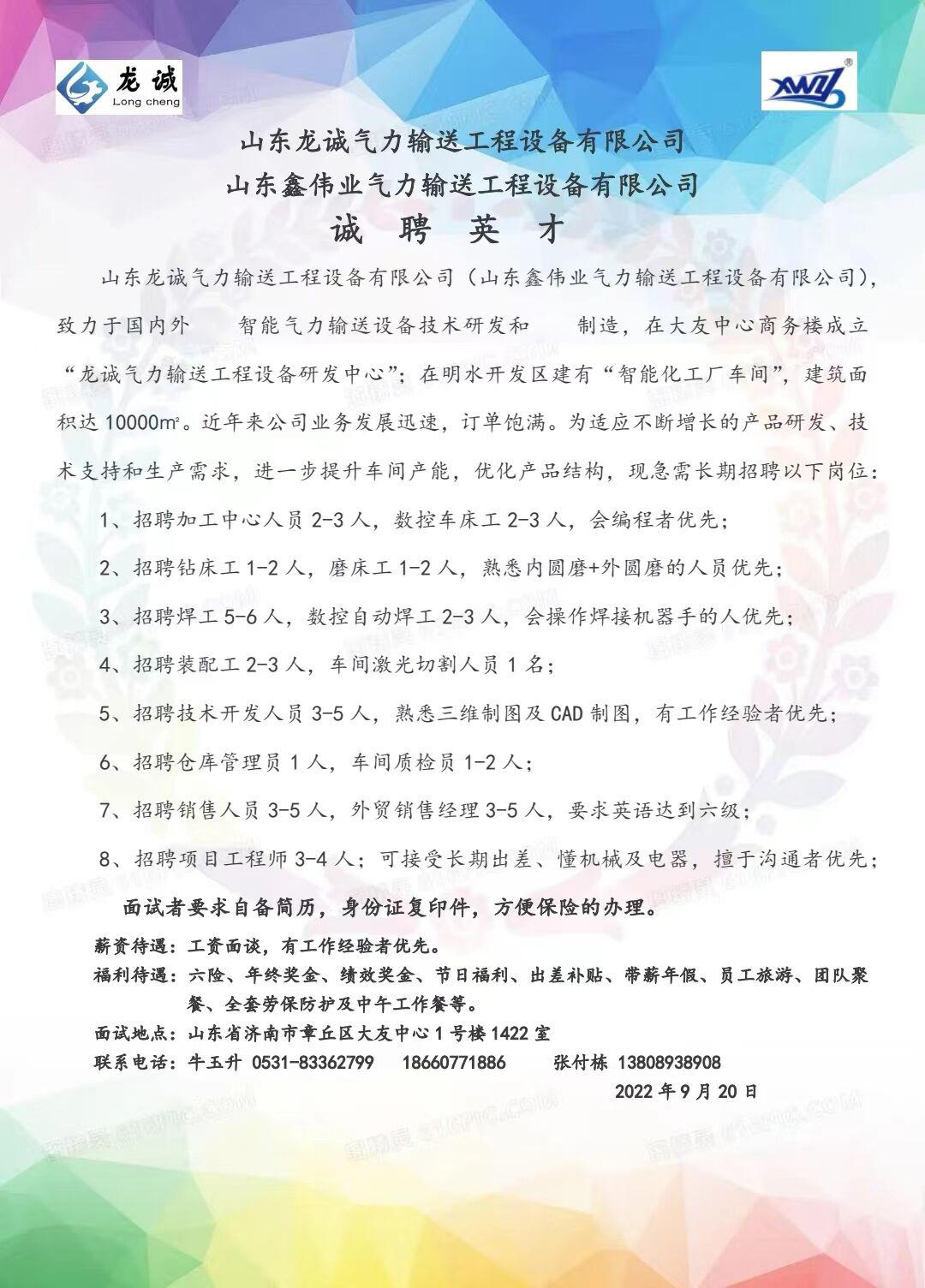 山東龍誠氣力輸送工程設備有限公司(山東鑫偉業氣力輸送工程設備有限公司),致力于國內外智能氣力輸送設備技術研發和制造,在大友中心商務樓成立 “龍誠氣力輸送工程設備研發中心”; 在明水開發區建有“智能化工廠車間”,建筑面積達10000㎡。近年來公司業務發展迅速,訂單飽滿。為適應不斷增長的產品研發、技術支持和生產需求,進一步提升車間產能,優化產品結構,現急需長期招聘以下崗位: