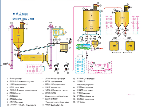干法脫硫系統 工藝流程 來自破碎機破碎后的石灰石顆粒經提升機提升至原料倉,經下方的給料機定量的將石灰石顆粒加入到石灰石球磨機內,給料量即可通過變頻器變頻調速,也可以通過螺旋稱給料機進一步實現給料量的調節。經球磨機粉碎后的物料一部分細的粉塵直接進入除塵器進行收集,一部分經提升機
