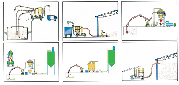 小車移動式氣力輸送系統 工藝流程 風機進口產生一定負壓力物料從吸嘴吸入,運送到分離器,物料在重力作用下進入卸料器,在電機帶動下均勻供料。風機出口產生一定壓力的高壓氣體,攜帶物料運送到指定位置。